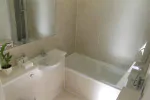 6′ 10″ x 5′ 6″ (2.08m x 1.68m) Bathroom comprised of white bathroom suite, paneled bath with shower over, low level WC, vanity unit with hand basin, wall mounted cabinet, wall mounted mirror, part tiled walls, extractor fan and heated towel rail.