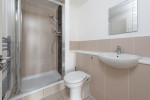 En suite comprises of a shower, low level WC, vanity unit and hand basin, part tiled walls and a heated towel rail.