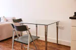 Living Area 26′ x 9′ 9″ narrowing to 7′ 2″ (7.92m x 2.97m narrowing to 2.18m) Easterly aspect triple glazed doors with “Juliette” balcony and window to the side, a 3 seat sofa, glass table, three wall mounted up lighters and wood flooring.