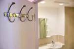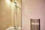 6′ 7″ x 6′ 8″ (2.01m x 2.03m) Panel bath with mixer tap and shower attachment, shower screen to the side. Work top with inset wash hand basin and mixer tap, W.C. with concealed cistern, tiled floor, part tiled walls, heated towel rail and ceiling spotlights.