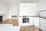 Large open plan area with period fireplace and radiator. Kitchen with modern black granite style worktop surface, white cupboards and built in oven with separate gas hob.