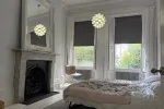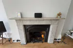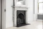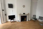 Period fireplace in spacious room with radiator. Two large sash windows with period features.